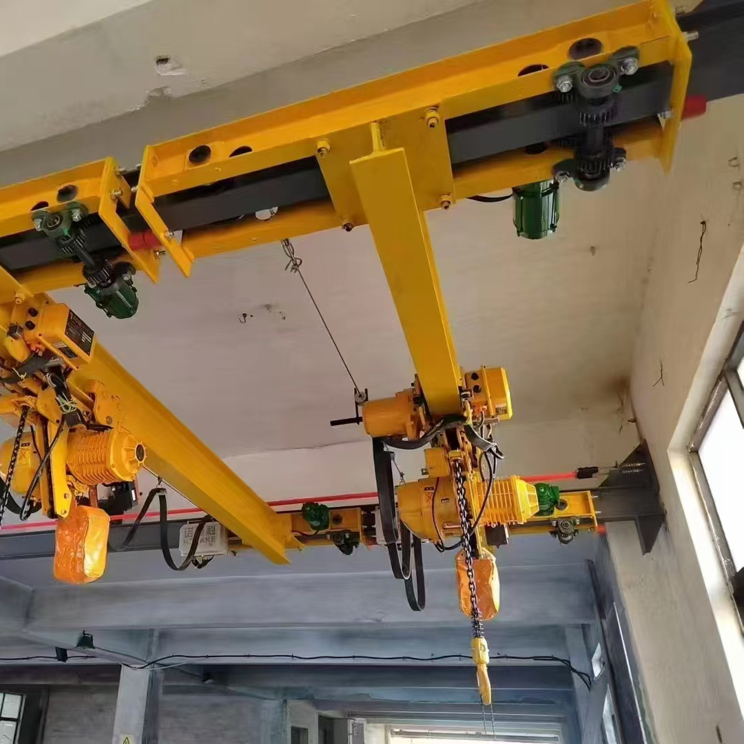 與CD1、MD1型電動葫蘆配套使用,構(gòu)成有軌運(yùn)行的單梁起重機(jī)。該懸掛起重機(jī)的運(yùn)行軌道使用用工字鋼,主梁兩端懸掛于工字鋼下方前后運(yùn)行,是小噸位起重設(shè)備。